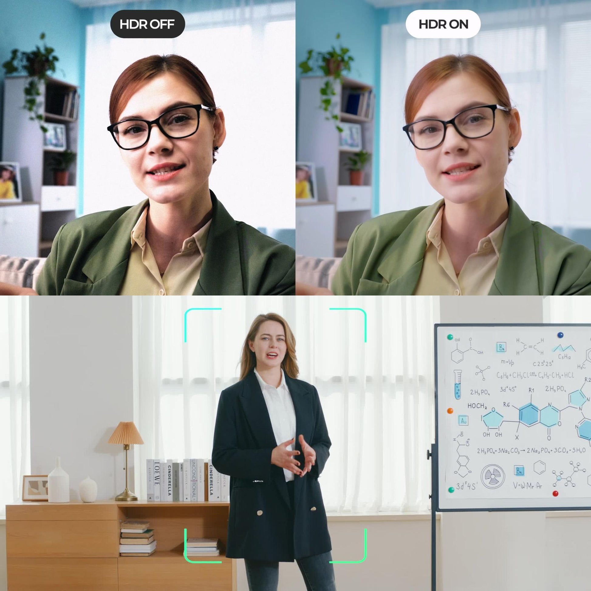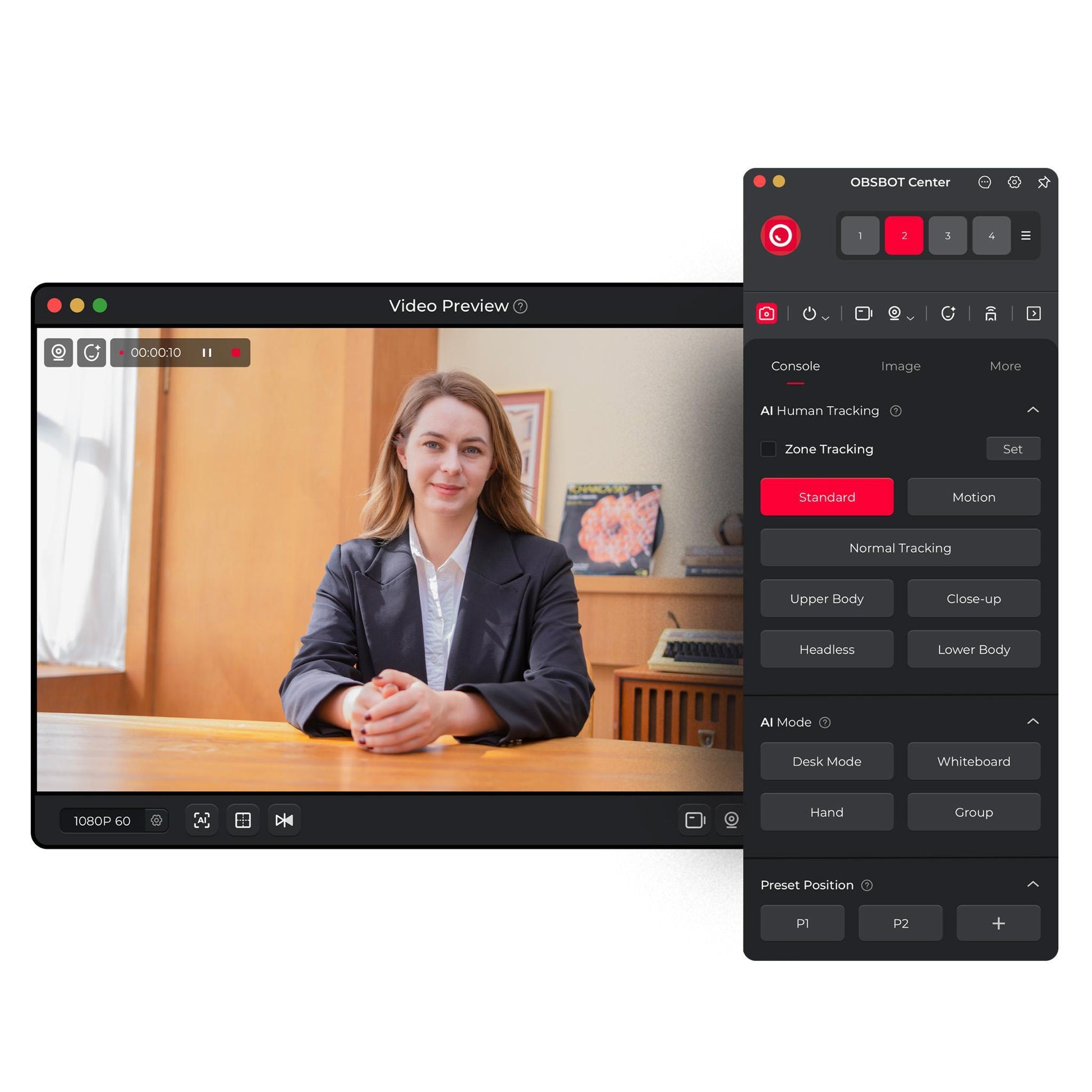 Auto-tracking follows body movements, ideal for presentations and active activities.