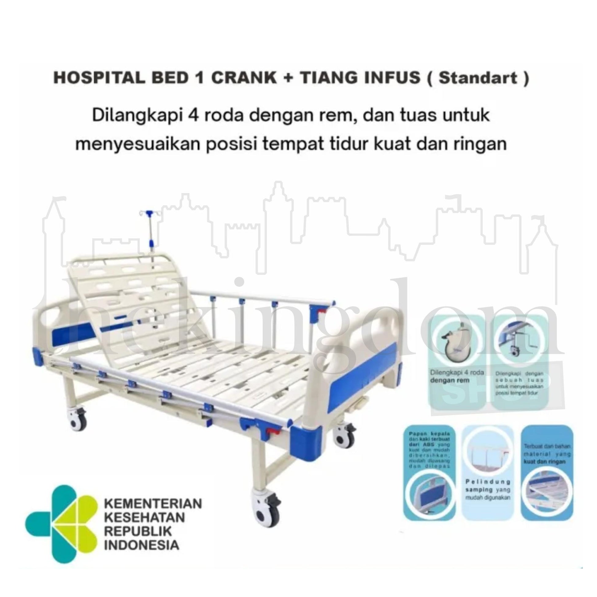 Onehealth Manual Hospital Bed adalah ranjang pasien manual yang dirancang untuk memberikan kenyamanan serta kemudahan dalam perawatan pasien, baik di rumah sakit, klinik, puskesmas, maupun penggunaan di rumah. Tempat tidur ini dapat diatur secara manual untuk menyesuaikan posisi kepala, kaki, hingga ketinggian ranjang sesuai kebutuhan pasien dan tenaga medis.