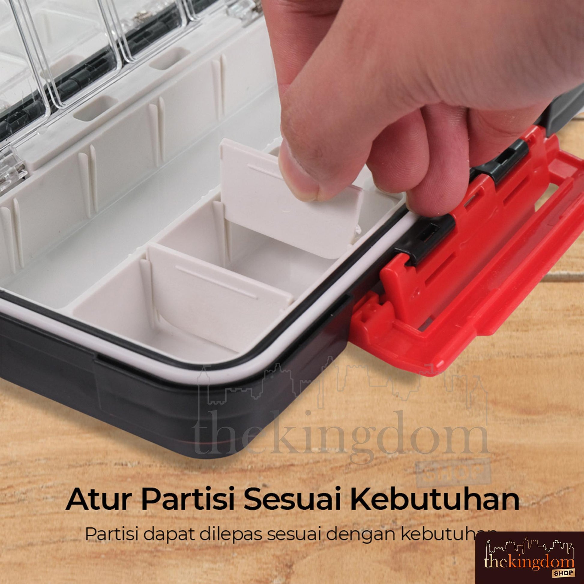Kotak ini menawarkan fleksibilitas tinggi dengan partisi yang dapat dilepas dan diatur sesuai kebutuhan. Jika Anda membutuhkan ruang lebih luas untuk menyimpan alat pancing yang lebih besar, Anda dapat dengan mudah melepas partisinya. Setiap partisi dilengkapi dengan tombol penguncian untuk memastikan partisi tetap stabil selama digunakan dan mudah dilepas jika diperlukan. Fleksibilitas ini memungkinkan Anda menyesuaikan kotak sesuai dengan jumlah dan ukuran peralatan yang Anda miliki.