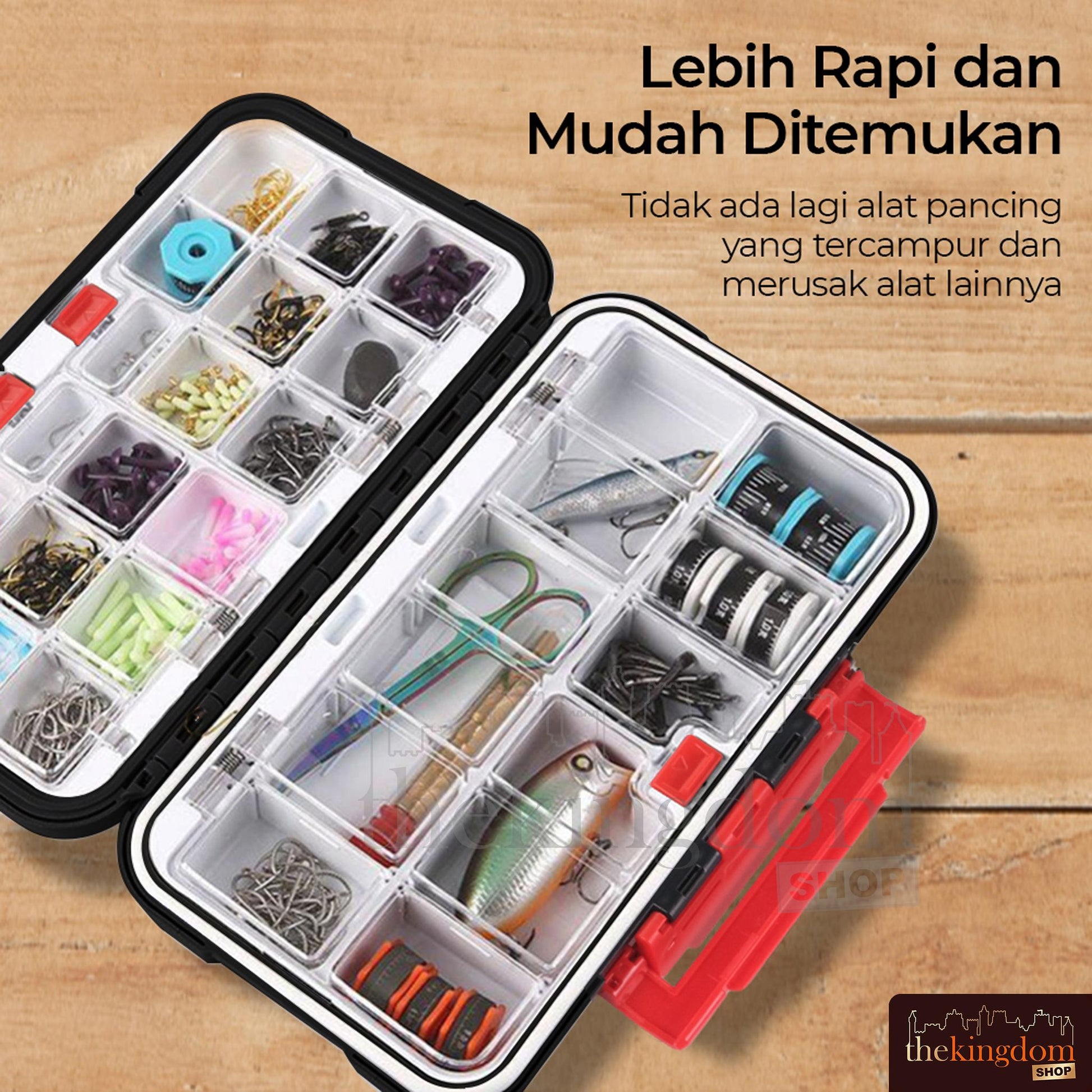 Dirancang dengan desain portabel yang praktis untuk dibawa ke mana saja. Dengan ukurannya yang kompak namun tetap menyediakan ruang penyimpanan yang cukup besar, kotak ini dapat dimasukkan ke dalam tas pancing Anda atau dibawa secara terpisah dengan mudah. Desain ini sangat cocok bagi para pemancing yang sering berpindah tempat atau bepergian jauh untuk mencari spot memancing terbaik.